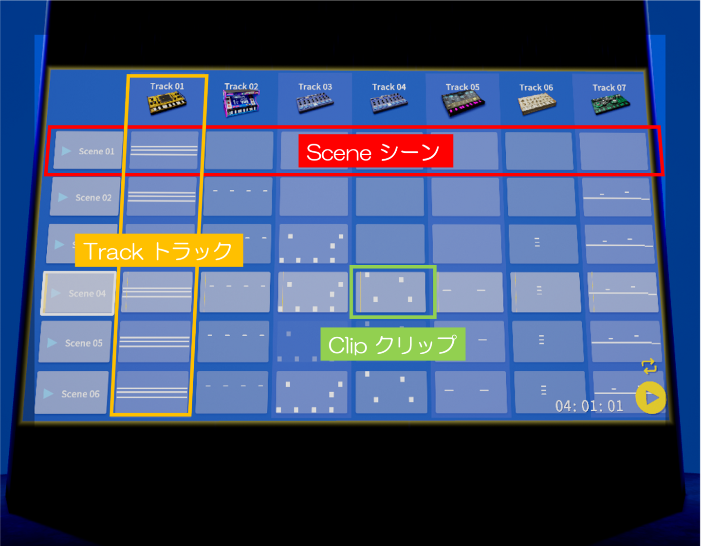 | シーン | 横の列は曲を構成する1つのブロックになっています。各トラックのクリップが同時に再生されます。 曲は小節単位の「イントロ」「Aメロ」「サビ」などの「シーン」で構成されています。 |