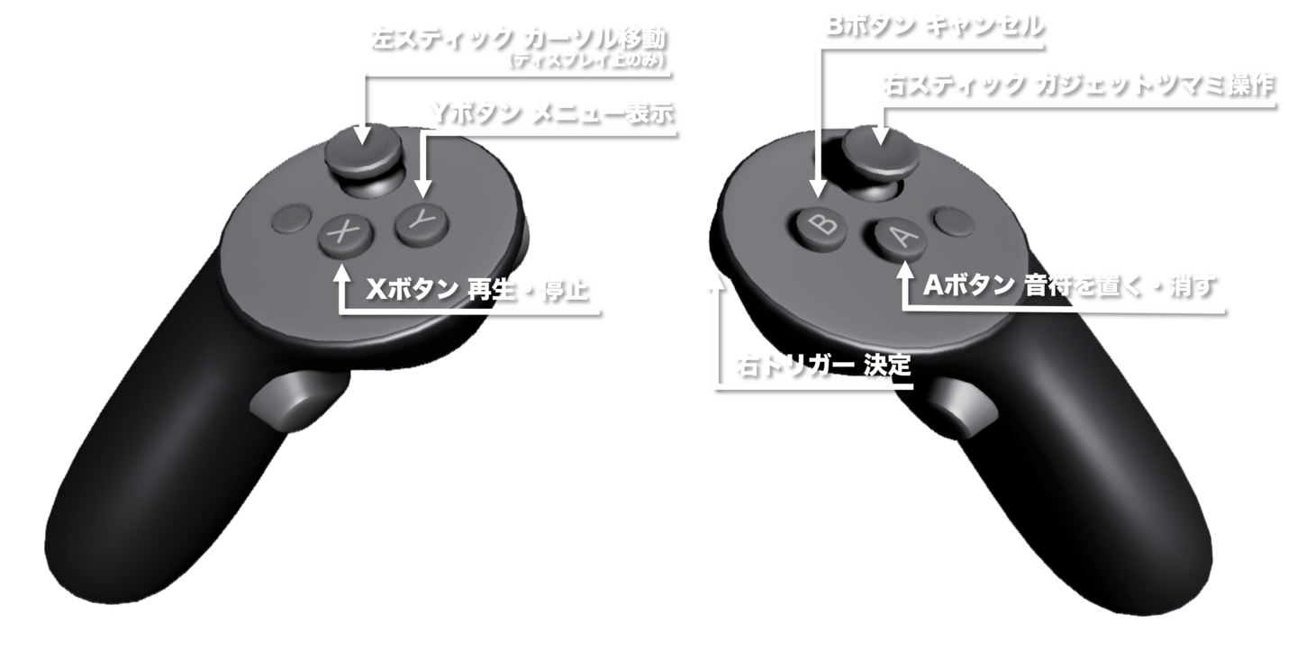 Aボタンでカーソルの位置にノートを置きます。ノートが置いてある場合は、そのノートを消します。ノートを置く際に、Aボタンを押したまま左スティックを左右に動かすことで長さを調整できます。 |