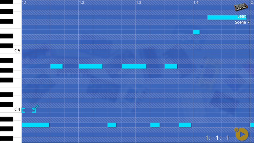 Pressing the A button or touch places a note at the current cursor location. If there is already a note there then it is replaced. While the A button is pressed, you can use the left joystick or the direction button to adjust the length of the note by moving left or right. |
