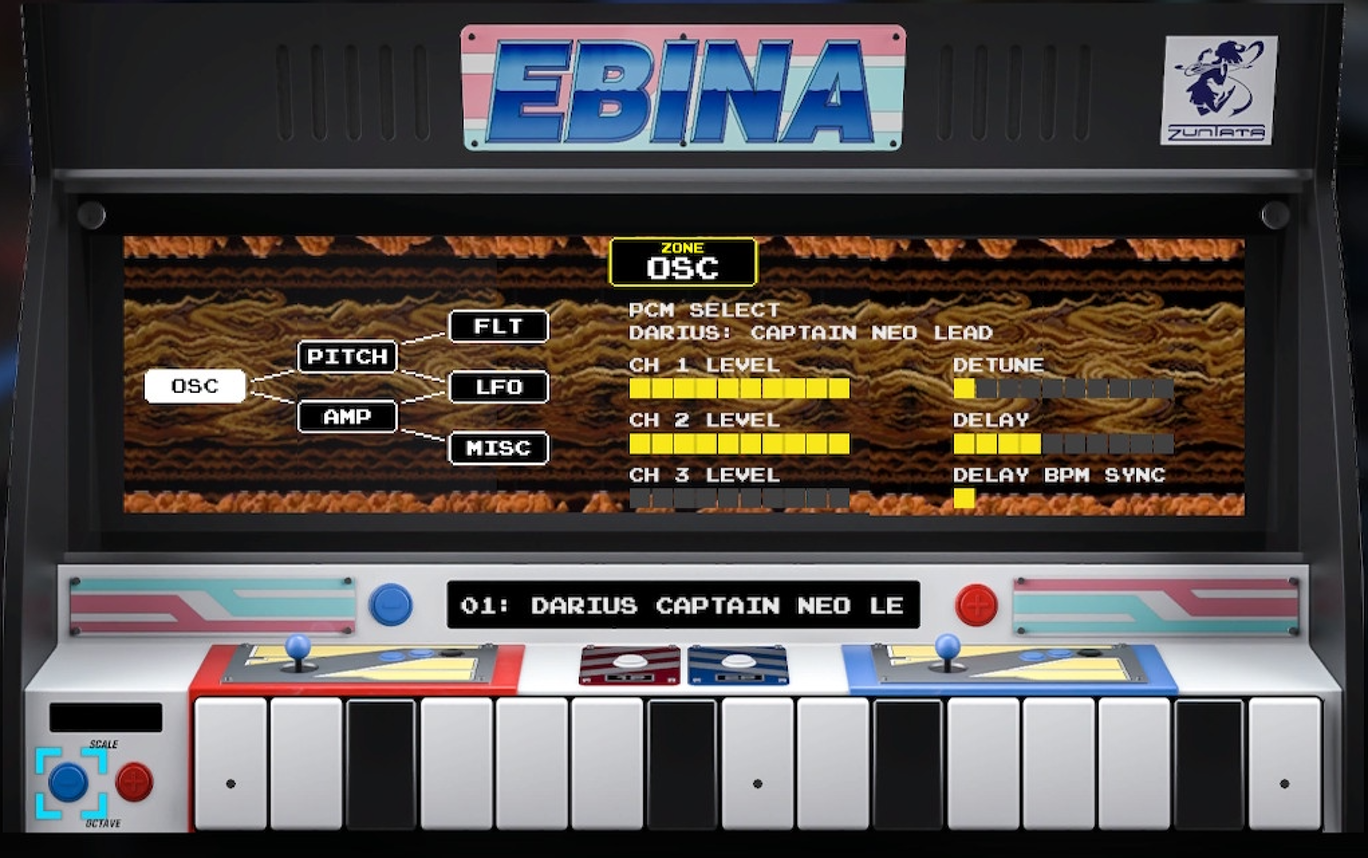 This is a synth gadget inspired by the Darius arcade cabinet and its distinctive three-screen design. Synth sounds have been recorded from arcade games such as Darius and The Ninja Warriors. Through collaboration with Taito, we are reproducing FM tone generator sounds (mostly), successfully reproducing sounds of these legendary arcade games.