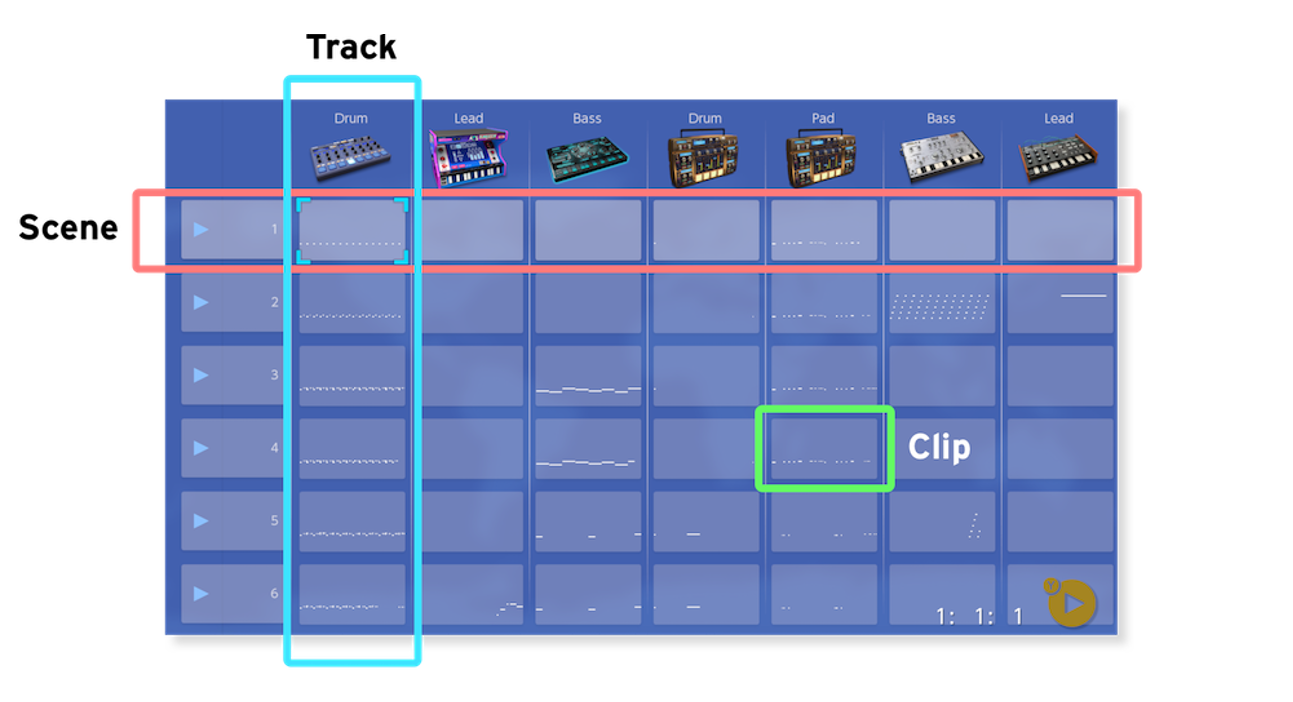 The horizontal blocks in each song represent scenes. The clips in each track are played back simultaneously. Songs are constructed by placing together a variety of scenes. For example, “Introduction”, “Melody A”, “Bridge” etc. |